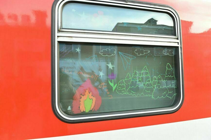Участники культурно-образовательного проекта «Поезд Памяти» вдохновились путешествиями по городам России и Белоруссии и нарисовали на окнах вагона достопримечательности, которые видели своими глазами.