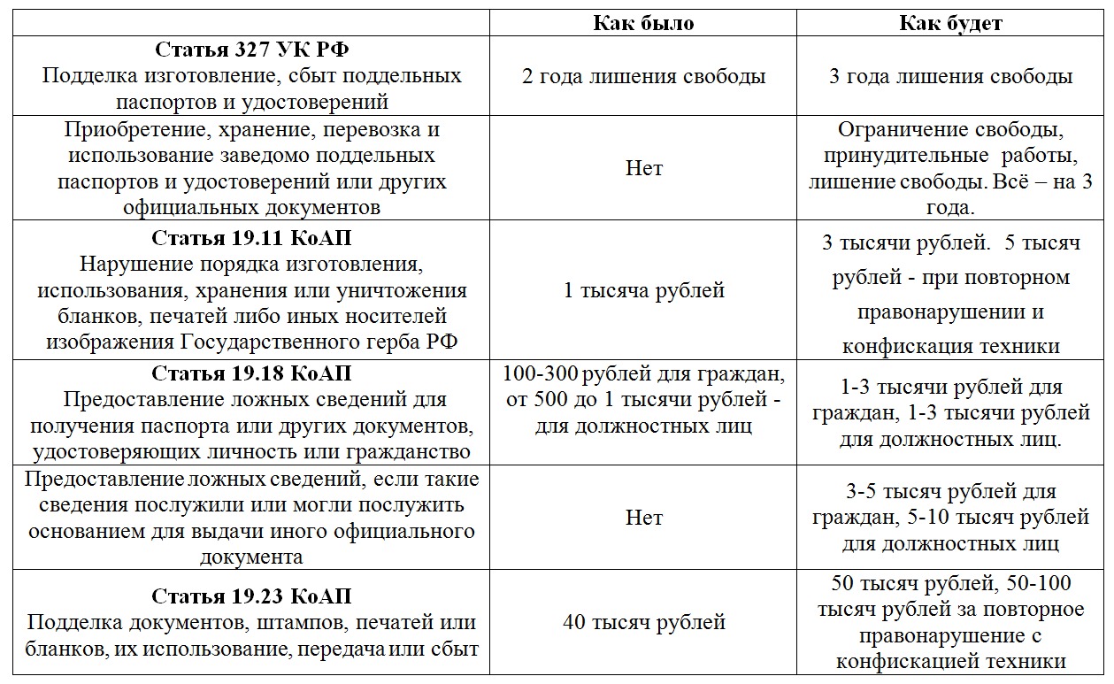 В стороне от будущих преобразований не остался и Административный кодекс. Согласно инициативе, штрафы за изготовление фальшивых документов, штампов, печатей и бланков, а также за их использование вырастут до 100 тысяч рублей. Отдельно будут наказывать за предоставление ложных сведений при сдаче документов на изготовление российского или заграничного паспорта.