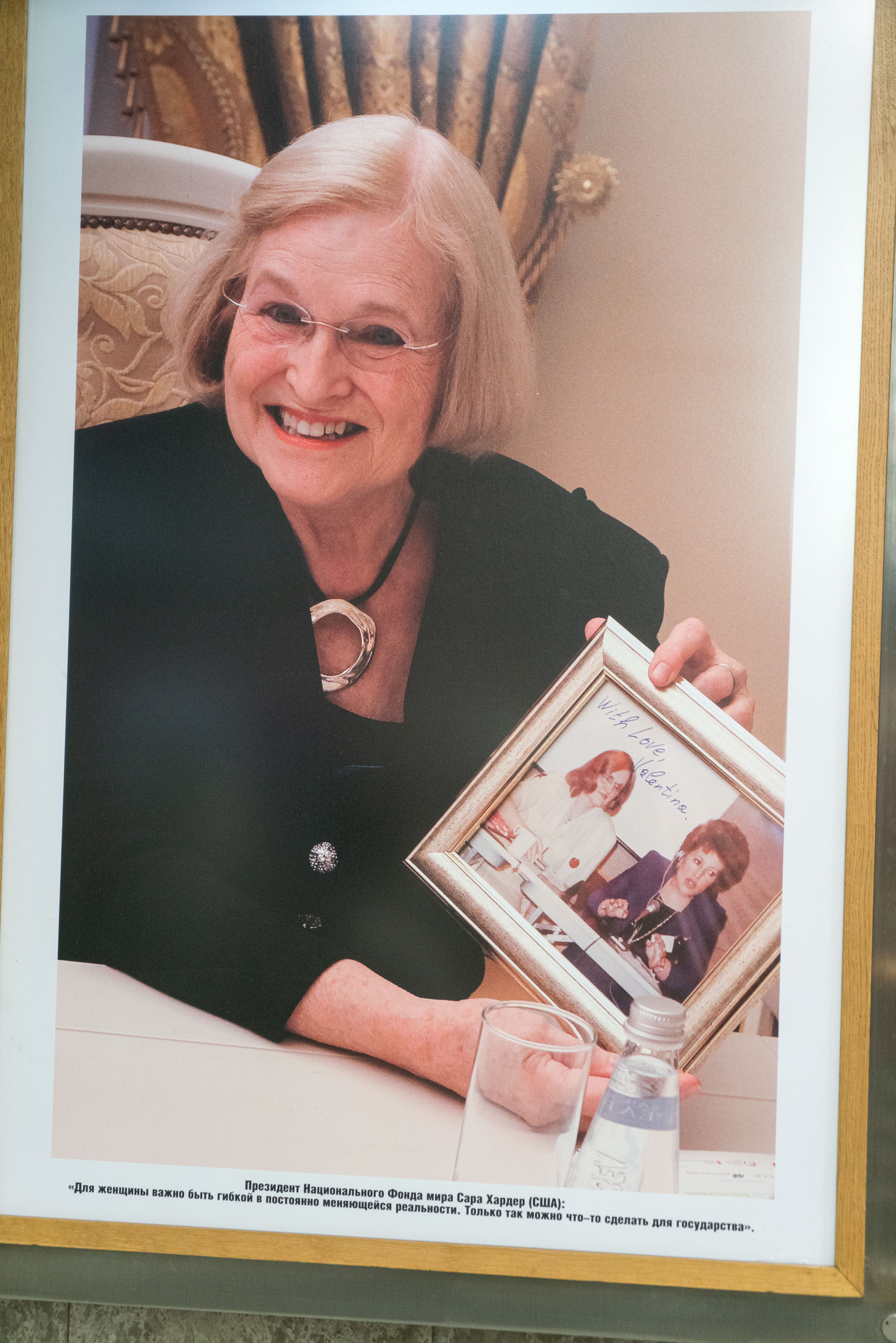 Одна из самых известных фотографий на выставке — портрет президента Национального фонда мира Сары Хардер. В руках она держит снимок 30-летней давности. На нём Сара Хардер запечатлена с Валентиной Матвиенко.
